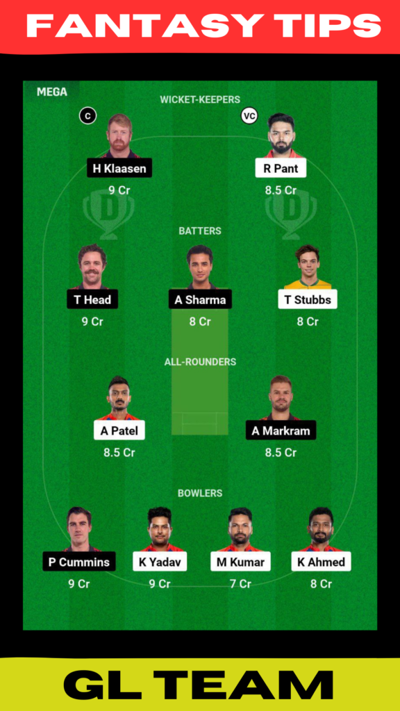 SRH Playing XI: Travis Head (LHB+ROB) Abhishek Sharma (LHB+LAO) Aiden Markram (RHB+ROB) Nitish Kumar Reddy (RHB+RAM-F) Heinrich Klaasen (WK) (RHB) Abdul Samad (RHB+LBS) Shahbaz Ahamad (LHB+LAO) Pat Cummins (C) (RHB+RAF) Bhuvneshwar Kumar (RAM-F) Jaydev Unadkat (LAM-F) Mayank Markande (LBS)